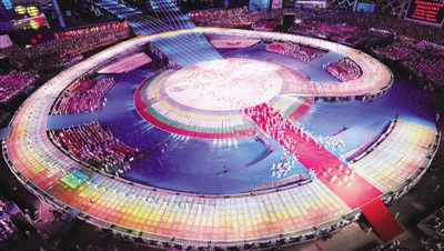 顿时,全场欢声雷动。电子屏上,五彩焰火喷薄绽放,彩色流星雨环场而下;场地中央,彩旗挥舞、彩绸飘飞,数百名中外大学生欢呼着跑上舞台,跳起活力四射的激情舞蹈。