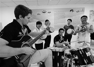 上图 8月11日上午,第二十六届世界大学生夏季运动会开幕前夕,来自澳大利亚体操队的选手在大运村音乐精神减压养护中心,体验音乐,在大赛前放松心情。