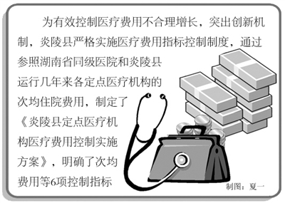 刘会才向记者介绍了炎陵县如何通过创新多措并举,有效控制医疗费用不合理增长的具体办法。一是在全省率先探索新农合单病种付费方式改革。合作医疗运行以后,通过对县内定点医疗机构实行住院病人网络化管理,有效规范了定点医疗机构服务行为。降低了自费药品用药比例。实行自费药品告知签字制度,严格按照省定标准将县级医院自费药品比例分别控制在5%以内。全县19家定点医疗机构项目内用药比例全部达到省定标准,其中,乡镇卫生院实现100%项目内用药,县中医院和妇幼保健院自费药品用药均控制在5%以内,县人民医院自费药品用药比例也从35.15%下降到5%。通过控制自费药品和诊疗项目,可报费用比例大大提高,乡镇卫生院可报费用比例达到97.91%,居全省同级医院前列。