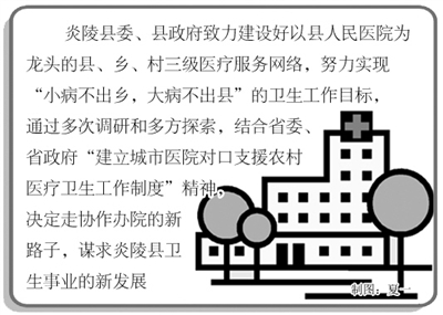 在炎陵县人民医院院长办公室里,记者见到了从湖南省人民医院下来蹲点担任院长的王枭冶。他告诉记者说:“县级医院和乡村卫生室最缺的还是人才。”据他介绍,炎陵县委、县政府致力建设好以县人民医院为龙头的县、乡、村三级医疗服务网络,努力实现“小病不出乡,大病不出县”的卫生工作目标,通过多次调研和多方探索,结合省委、省政府“建立城市医院对口支援农村医疗卫生工作制度”精神,决定走协作办院的新路子,谋求炎陵县卫生事业的新发展。通过多方努力,2009年8月21日,炎陵县人民医院与湖南省人民医院正式签订了为期6年的对口协作协议,开展对口帮扶工作。协作期间,成立医院联合管理委员会,宏观把握医院工作的总体发展、基本建设、人员管理和财务管理,并帮助和解决、协调各部门的问题,负责医院重大事项的决策。