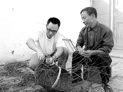 | 8月6日,在吴起县白豹镇王湾村,村民郭对芳在教本报记者林火灿(左)用藤条编篮子。 朱 东摄 |