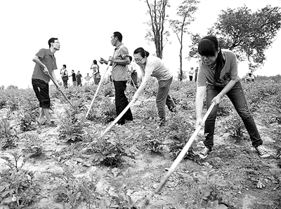 | 在延长县南河沟乡左溪村村民指导下,中国经济网记者王姣雁(右二)等为土豆田锄草松土。 常胜军摄 |