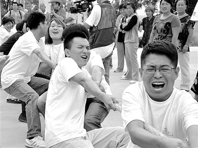 | 8月5日,本报记者周琳(右一)在延长县张家滩镇下盘石村参加农民运动会拔河比赛。 赵 光摄 |