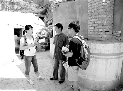 | 在吴起县薛岔乡郭畔村,本报记者贺浪莎(左一)在采访当地致富带头人杜修义(中)。 王春晨摄 |