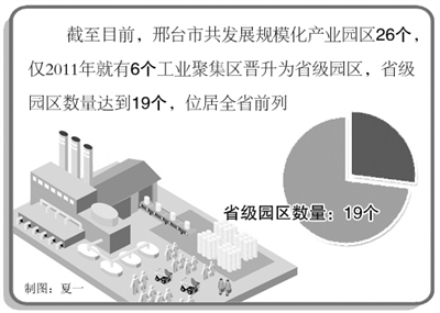 邢台市由于起步较晚,基础薄弱,在河北省仍属于欠发达区域。如何在新的历史条件下实现跨越发展,邢台市委、市政府有着清醒的认识:发展经济最为忌讳的是眉毛胡子一把抓,只有集中各种优势资源,实施重点突破,才能取得事半功倍的效果。而建设规模化产业园区则是最好的载体。为此,邢台市狠抓了规模化产业园区建设,截至目前,全市共发展规模化产业园区26个,仅2011年就有6个工业聚集区晋升为省级园区,省级园区数量达到19个,位居全省前列。