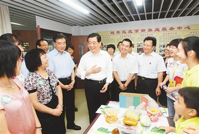 广州市北京街盐运西社区是一个老社区,近年来在社区管理和服务方面进行了积极探索,取得了显著成效。在家庭综合服务中心,胡锦涛同一些正在活动的老人、孩子和正在忙碌的社工、志愿者亲切交谈,了解中心提供老人和孩子日托、送餐等便民服务情况。党员服务站里,几名党员正围绕居民关注的问题研究解决办法。总书记仔细听他们讨论,并向他们了解社区组织党员和群众参与社区管理和服务的具体做法。看到盐运西社区管理井然有序、服务周到细致,老社区焕发出了新活力,胡锦涛感到欣慰。他语重心长地说,社区建设是社会管理的基础环节。希望盐运西社区按照中央提出的加强和创新社会管理的要求,进一步提高社区管理和服务水平,真正做到和谐社区大家共建、社区和谐大家共享。