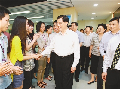深圳华强文化科技集团股份有限公司主要从事特种电影、数字动漫、主题公园等文化产品的设计、研发、生产。胡锦涛考察了这家企业的特种电影生产线和数字电影特效实验室,饶有兴致地观看了企业制作的4D电影片段,还面对电子屏与一个可爱的动漫角色进行了风趣对话。这家企业的文化与科技相融合的经营思路,给总书记留下深刻印象。他希望企业坚持以市场需求为导向,以创新创意为动力,进一步打造具有更高知名度和更强竞争力的自主品牌,争当文化产业发展的领头羊,向广大群众提供更多更好的文化产品,为推动社会主义文化大发展大繁荣作出积极贡献。看到企业员工都很年轻,胡锦涛大声对他们说:“文化产业是大有希望的产业,希望就在你们身上!”总书记热情的话语让员工们深受鼓舞,大家情不自禁地鼓起掌来。