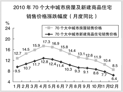 房价快速上涨势头得到初步遏制。据国家统计局统计,2010年70个大中城市新建商品住宅销售价格同比涨幅4月份曾达到12.8%的高点,此后逐月下降,年末回落到6.4%。2011年以来,房价环比下降和涨幅回落的城市数量不断增加,6月份北京新建商品房价格环比下降7%。