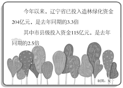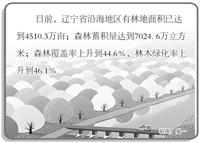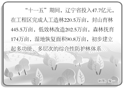 “十一五”期间,辽宁省投入47.7亿元,在工程区完成人工造林220.5万亩,封山育林445.5万亩,低效林改造202.5万亩,森林抚育174万亩,湿地恢复面积90.8万亩,森林覆盖率提高了9个百分点,2010年的森林覆盖率达到51.6%,初步建立起多功能、多层次的综合性防护林体系。今年以来,辽宁省沿海各地林业生态建设投入进一步加大,截至目前已经投入造林绿化资金204亿元,是去年同期的3.3倍,其中市县级投入资金115亿元,是去年同期的2.5倍。
