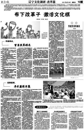 非时政类报刊和国有文艺院团转企改制是今明两年全国文化体制改革的两大重点任务。辽宁省在这两个领域也作出了积极探索。辽宁省将中部城市群各家晚报和辽沈晚报进行整合,对辽沈晚报进行整体转企改制,为全国非时政类报刊出版单位的转企改制,特别是省级晚报、都市类报纸的转企改制做出了榜样、树立了典型。
