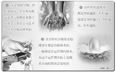 华泰联合证券基金研究中心总经理、研究总监王群航认为,首先要明白的是无论如何分级,杠杆如何高,其实都是“羊毛出在羊身上”。所有收益或者亏损都是来源于母基金,基金公司是不会因为分级而埋单的。在市场上扬的时候,高杠杆部分产生的超额收益是产生于稳健部分的贡献;在市场下跌的时候,稳健部分的固定收益则来源于高杠杆部分的超额损失。所以理论上,基金公司是可以按照任意方针制定分级规则的。这些规则也不会对基金的运作产生任何的影响,但对持有人的风险和收益有很大关系。