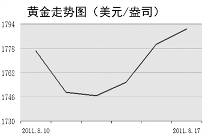但这种回调并没有延续到本周,由于欧美经济数据大多表现不佳,欧美债务危机解决前景也颇令市场失望,避险买盘再次提振金价,本周以来两个交易日现货金连续大幅收高,截至8月17日15:30,现货金最新报价为1787.30美元/盎司,略高于上一交易日收盘价。