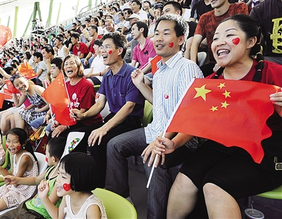 8月17日,深圳大运会宝安区体育场内,观众正热情地为中俄女足队员加油。 本报记者 李树贵摄