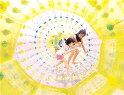 8月17日,北京市朝阳区将台洼学校20余名来京务工人员的子女来到奥林匹克公园,在青年志愿者引导下,体验滚筒、投篮等趣味体育运动,共享快乐时光。 本报记者 赵 晶摄