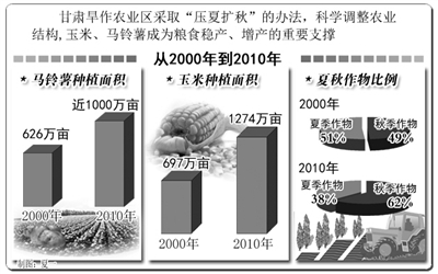 随着全膜双垄沟播技术的推广,甘肃旱作农业区采取“压夏扩秋”的办法,扩大玉米、马铃薯等高产秋季作物的种植面积,减少冬小麦种植面积,科学调整了农业结构。据统计,全省玉米面积已由2000年的697万亩扩大到2010年的1274万亩;马铃薯面积由626万亩扩大到近1000万亩;夏秋作物比例由51∶49调整为38∶62,玉米、马铃薯成为甘肃粮食稳产、增产的重要支撑。