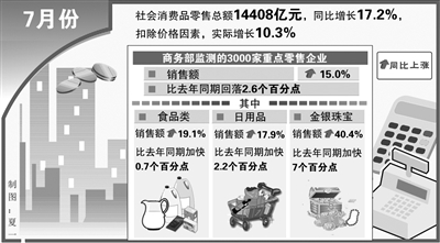 二是食用类、保值类等商品需求持续旺盛。商务部监测的3000家重点零售企业中,食品类销售额同比增长19.1%,日用品销售额增长17.9%,分别比去年同期加快0.7个和2.2个百分点。受国际黄金价格高涨和保值避险偏好增强影响,金银珠宝销售额增长40.4%,比去年同期加快7个百分点。