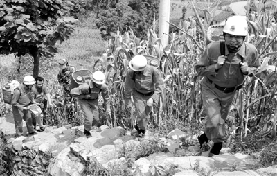 8月25日,贵州省黔西南州消防官兵翻山越岭,为兴义市敬南镇巴布村76岁的李永香老奶奶送水,解决她家两位老人和两个小孙子10天的饮水困难。 刘永松摄(新华社发)