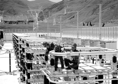 8月25日,国家电网山东送变电工程公司员工在海拔3800米的拉萨换流站抓紧施工。该站是世界上海拔最高的换流站,是青藏联网工程的重点项目,目前该站主体工程已经完成,预计今年10月底正式投入运营。