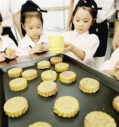 8月25日,淮北市商业局幼儿园的小朋友在面点师的指导下学做月饼。