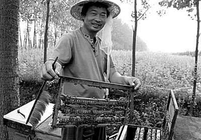 来自浙江的养蜂人康明东正在河南省驻马店市平舆县东和店镇开箱取蜜。眼下,正值白芝麻花开时节,平舆县30万亩芝麻田为养蜂人提供了充足的“蜜源”,引来大批赶蜂人前来“赶花期”。