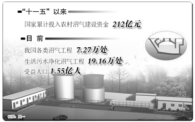 “十一五”以来,国家累计投入农村沼气建设资金212亿元。