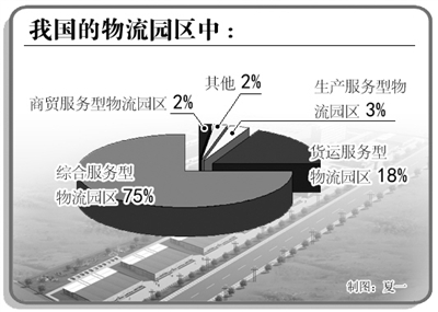 根据国家标准《物流园区分类与基本要求》划分,2008年第二次全国物流园区调查结果显示,我国的物流园区中,综合服务型物流园区占75%,货运服务型物流园区占18%,生产服务型物流园区占3%,商贸服务型物流园区占2%,其他占2%。