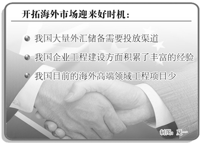 首先,我国目前储备的大量外汇需要一个投放的途径。美债评级降低,欧洲债务危机严重,通过对外投资控制国外的资源或具有技术优势的资产,既是资金安全的需要,也是资源安全的需要;其次,我国企业从事工程建设已有多年历史,积累了相当多的经验,我们已经有能力“走出去”了;再次,我国目前的海外工程主要是进行基础建设,技术含量不高、资金总量较少,虽然有少数涉及核电等高端领域的工程项目,但是相比日本等发达国家实在是少之又少。当今各国无不在大力开拓海外市场,我们已经在这场战役中落了下风。因此,只有坚定地推行“走出去”的政策,才有可能在未来的国际市场上占据一席之地。