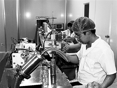 上图 养蜂业已成为赞皇县农民脱贫致富的新亮点。目前,全县蜂制品总产量已达2000吨,该县正向有关部门申报“中国养蜂之乡”。图为赞皇县蕊源蜂业有限公司现代化的灌装蜜糖生产线。