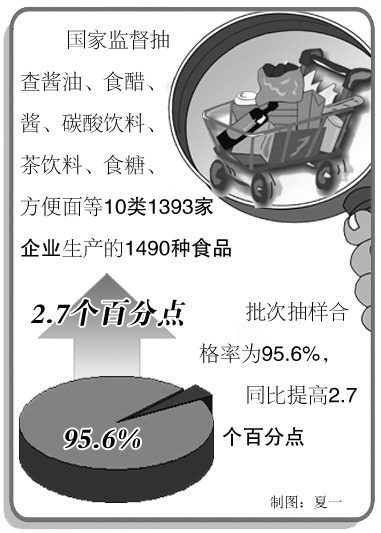 本报北京8月29日讯 记者任意报道:国家质检总局今天召开新闻发布会,公布了上半年产品质量基本状况。检测结果显示,食品常见问题依然存在,瓶桶装饮用水、酱、食糖等产品存在微生物指标超标、食品添加剂使用控制不当、蛋白质含量不达标等问题。在流通领域依然存在经营者擅自更改生产日期、销售过期变质食品等问题。国家监督抽查酱油、食醋、酱、碳酸饮料、茶饮料、食糖、方便面等10类1393家企业生产的1490种食品,批次抽样合格率为95.6%,同比提高2.7个百分点。