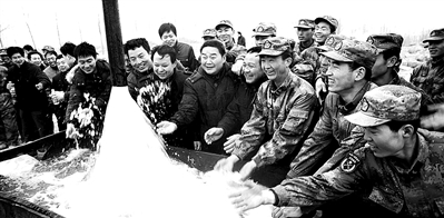 开钻后,全村200多名村民纷纷到钻台旁帮忙,在外地打工的青年也赶了回来。16个日夜,披星戴月,战士们汗水湿透的棉衣经常被夜风吹得冻成“冰坨”。3月6日,一口110米深的井终于完成了。