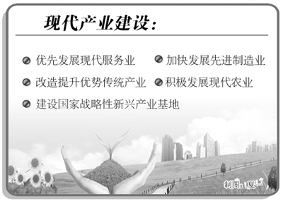 现代产业建设工程。“十二五”时期投资5360亿元,加快建设全球重要现代产业基地,优先发展现代服务业,加快发展先进制造业,改造提升优势传统产业,积极发展现代农业,建设国家战略性新兴产业基地,大力发展高端新型电子信息、新能源汽车等重大产业,形成布局合理、竞争力强的现代产业体系。