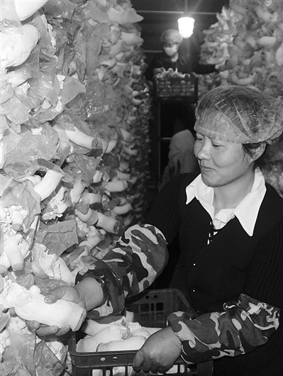 8月25日,内蒙古通辽市科尔沁区木里图镇大成食用菌产业孵化基地,在村民王丽萍承包的工厂化生产厂房里工人们正忙着采收成熟的杏鲍菇。这里实行“公司+基地+农户”的经营模式,公司与各承包户签订合同,提供全程技术服务,按保护价收购全部鲜菇,每个厂房能为承包户带来5万元的年纯收入。 本报记者 罗 霄 通讯员 邵学东摄影报道