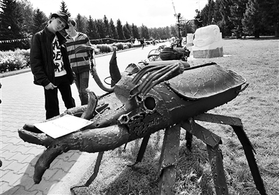 日前,在俄罗斯叶卡捷琳堡市中央公园举行的第三届叶卡捷琳堡国际“洛姆”雕塑艺术节上,观众驻足欣赏。“洛姆”在俄语中意指废金属。经过俄罗斯及其他国家艺术家们的精心创作,原本黯淡无光的金属垃圾成为令人眼花缭乱的雕塑作品。艺术家们的创造意在呼吁人们清理工业金属废料,保护城市人居环境。 新华社发