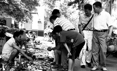 河北的老魏一大早来到岳王艺术城,在西门前的地摊上占了个好位置。一上午的时间,他的钱币杂件就卖了1万多元。每逢周末,老魏和他的同乡就结伴来到这里。