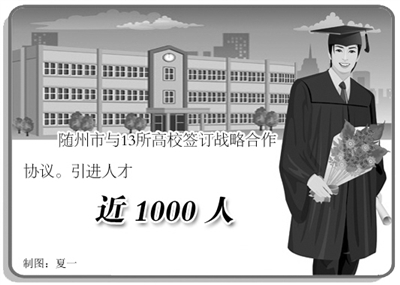 本报讯 记者魏劲松、通讯员贾雪莹报道:与13所高校签订战略合作协议、43个合作项目顺利开展、攻克36项技术难题、申请专利14项、引进人才近1000人……这串数字,代表了一年来湖北省随州市在高校人才引进与科技合作方面所取得的可喜成绩。