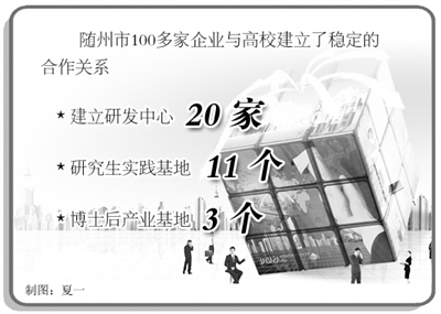 据随州市委常委、组织部长雷文洁介绍,目前随州市有100多家企业与高校建立了稳定的合作关系,已建立20家研发中心,11个研究生实践基地,3个博士后产业基地。