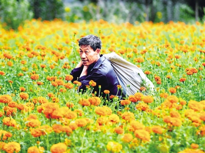 8月31日,内蒙古通辽市奈曼旗八仙筒镇岱林筒村花农王金义在收获药用万寿菊。近日,内蒙古奈曼旗境内科尔沁草原上万寿菊种植基地喜获丰收。从2010年开始,奈曼旗在农业灌溉基础条件较好的5个苏木镇场试种药用万寿菊16000多亩,打造万寿菊种植加工基地。 新华社记者 张 领摄