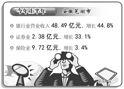 数据显示,今年上半年,在银行业快速发展的拉动以及其他金融业高速增长的助推下,芜湖金融企业实现营业收入63.15亿元,同比增长36.6%。其中,银行业营业收入48.49亿元,增长44.8%;证券业2.38亿元,增长33.1%;保险业9.72亿元,增长3.4%;其他金融业2.56亿元,增长63.2%。在金融产业不断发展的支持下,芜湖市经济发展交出了一份不错的成绩单:2011年1月至6月,完成固定资产投资582亿元,增长37%;规模以上工业实现增加值385.4亿元,增长20.8%;实现财政收入143.3亿元,增长48.5%;外贸进出口总额17.8亿美元,增长62.3%,初步实现了“十二五”规划的良好开局。