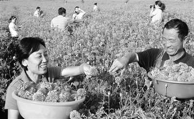 9月2日,河北省承德市平泉县平房乡小茅兰沟村村民正在万寿菊园区采摘。平泉是河北省花卉产业发展的重点县之一,有17个乡镇种植万寿菊。目前菊花长势良好,正是采摘旺季。 本报记者 李景录摄