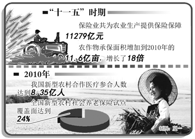 目前,我国农业保险正迎来发展机遇期。据统计,“十一五”时期,我国农业保险的保费收入从2006年的8亿元增加到2010年的135.68亿元,增长了近16倍。5年来,保险业共为农业生产提供保险保障11279亿元,我国农作物承保面积从2006年的0.6亿亩增加到2010年的11.6亿亩,增长了18倍。累计承保农作物29亿亩,承保生猪及能繁母猪2亿头,承保森林7.6亿亩。农业保险的全面开展,使农村、农民的防灾、抗灾能力显著增强。