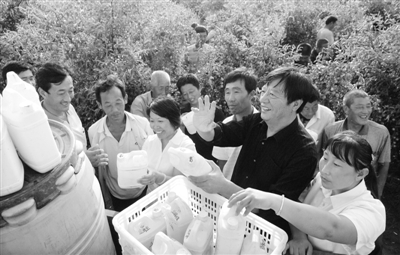9月3日,山东沾化县富国街道胡营村的生态冬枣产业园无公害冬枣树上果实累累。来自滨州职业学院的生物专家张孟海(前排右二)正在为园区枣农讲解新型无毒生物农药和有机生态肥料的使用方法。去年以来,该产业园区采取校企合作、农企对接生产经营方式,大大促进了绿色产业的发展。 本报记者 李树贵摄