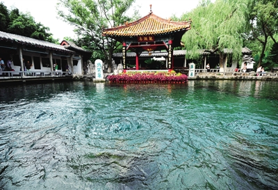 这是9月5日拍摄的济南趵突泉“三股水”景观。当日7时30分,趵突泉地下水位为28.64米,趵突泉持续喷涌8年将成定局。2003年9月6日,趵突泉恢复喷涌。 崔 健摄(新华社发)
