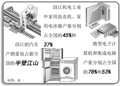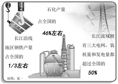 如今,长江沿线地区钢铁产量占全国的三分之一左右,分布着宝钢、沙钢、武钢、马钢、南钢等大型钢铁企业;长江沿江形成了上海、南京、安庆、九江、岳阳、武汉等炼油中心和石油化学工业基地,石化产量占全国的46%左右;长江流域还拥有华东、华中、西南三大电网,装机量和发电量都超过全国的50%;沿江的汽车产销量也占据全国的半壁江山,形成了上海、武汉、重庆、南京、芜湖等主要的汽车工业基地;沿江机电工业竞争优势同样突出,家用洗衣机、家用电冰箱产量分别占全国的45%和37%,微型电子计算机和集成电路产量分别占全国的78%和53%。