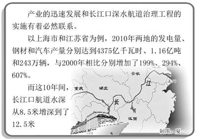 《长江口深水航道治理工程评估报告》认为,上述产业的迅速发展和长江口深水航道治理工程的实施有着必然而直接的联系。以上海市和江苏省为例,2010年两地的发电量、钢材和汽车产量分别达到4375亿千瓦时、1.16亿吨和243万辆,与2000年相比分别增加了199%、294%、607%。而这10年间,长江口航道水深从8.5米增深到了12.5米。