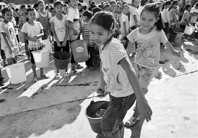 在广西田林县旧州镇中心小学,孩子们在取政府送来的水。罕见夏秋连旱已造成田林县1.3万人需靠政府送水生活(9月7日摄)。广西气象部门统计显示,今年7月1日至8月底,广西平均降水量228毫米,比常年同期偏少近五成。