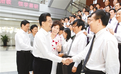 当胡锦涛就要离开学校时,热情的师生们拥到路边,争相问候总书记,胡锦涛向大家频频挥手致意。热烈的掌声此起彼伏,整个校园沉浸在欢乐和兴奋之中……