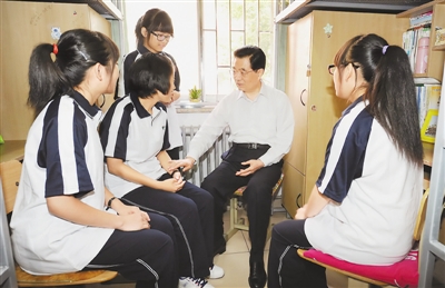上午9时许,胡锦涛前往北京市第八十中学望京校区考察。一到学校,总书记先参观了校史陈列,了解这所学校的发展历程和教学成果,希望他们认真总结办学经验,进一步提高教育质量,努力促进学生全面发展、成长成才。