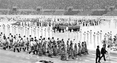 伴随着欢快的民族风格进行曲,来自各省区市的运动员步入会场。广西代表队唱起《刘三姐》中的山歌;内蒙古代表队伴着马头琴跳起舞;西藏代表队手捧哈达,跳起雪域高原特有的面具舞和手鼓舞……当参赛项目最多、阵容最大的东道主贵州代表队入场时,他们跳起的芦笙舞令全场掌声雷动。
