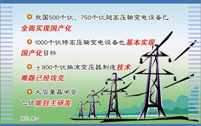 目前,我国500千伏、750千伏超高压输变电设备已全面实现国产化,1000千伏特高压输变电设备也基本实现国产化目标,±800千伏换流变压器制造技术难题已经攻克,大容量晶闸管已经能自主研发。依托重大工程,国产输变电设备技术水平得到了全面升级,尤其是我国自主研制的特高压设备,已主导了国内的高端市场,在国际上已开始与跨国公司展开竞争。实践证明,通过参与特高压相关设备产品的研发,国内电工装备企业抓住机遇,在较短时间内缩小了与ABB、西门子等世界电工电气巨头的差距,有的方面甚至超越了跨国公司。