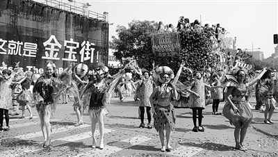 巡游演员经过北京王府井金宝街。作为第二届王府井国际品牌节活动之一,北京金宝街嘉年华巡游活动日前举行。700余名表演者组成的巡游方阵为观众带来一场视觉盛宴。据介绍,未来5年,北京王府井金宝街地区将打造成集国际品牌旗舰店、顶级品牌会所、高端购物中心等为一体的顶级购物区。 本报记者 赵 晶摄